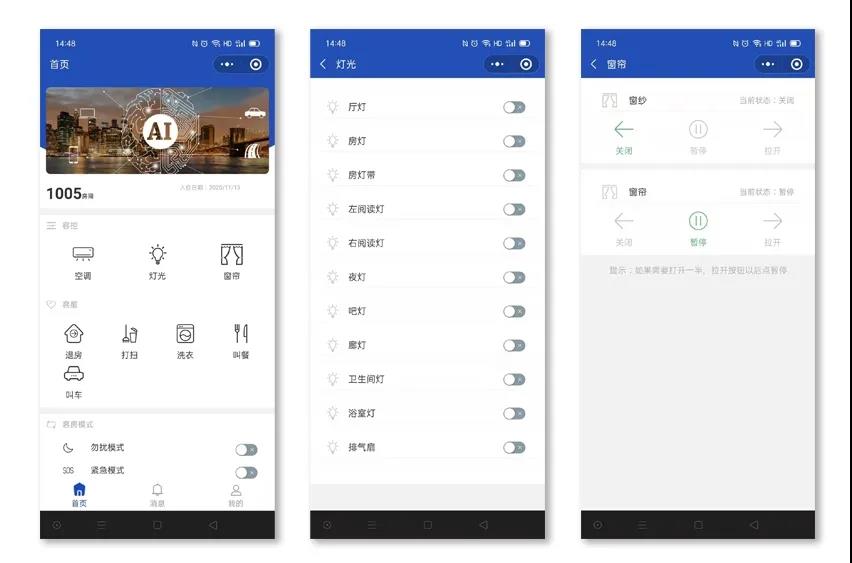 當(dāng)用戶推開房門,房間會(huì)自動(dòng)開啟迎賓模式,歡迎顧客入住。同時(shí)燈光緩緩亮起,紗簾自動(dòng)關(guān)閉,智能化的場(chǎng)景提高酒店科技感。屋內(nèi)的設(shè)備都可以通過智能音箱進(jìn)行語音操控,而且它還提供生活查詢、天氣預(yù)報(bào)、小度AI語音陪聊等多種服務(wù),豐富了用戶的生活,增加酒店趣味性。