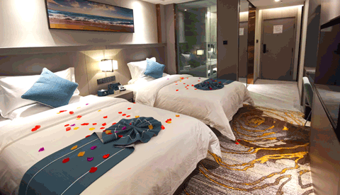 并通過專業(yè)的照明設(shè)計(jì),結(jié)合見光不見燈的產(chǎn)品設(shè)計(jì),給予場景恰到好處的照度、色溫。讓視覺跟隨燈光的引導(dǎo)落在翠綠植物、山水壁畫、澄亮的銅色臺燈等裝飾亮點(diǎn)上。讓酒店自身的設(shè)計(jì)得到更好的體現(xiàn),客人也能獲得更好的入住體驗(yàn)。 將客房內(nèi)整體的照度降低,創(chuàng)造觀影氛圍,讓人的視覺焦點(diǎn)自覺集中在電視屏幕上,享受觀影的樂趣。而床頭左右兩側(cè)的臺燈保留60%的亮度,讓室內(nèi)在自然光線不足的情況下,依然可以看清床頭周邊環(huán)境,保留切換模式、處理手邊事物等所需照度。 當(dāng)你在外游玩了一天,疲憊又想入睡時(shí),只需語音喚醒小度開啟睡眠模式,燈光、窗簾、電視都將自動關(guān)閉,空調(diào)系統(tǒng)會切換到睡眠模式(自動降低風(fēng)量,避免深夜受涼),同時(shí)背景音樂系統(tǒng)也會響起輕柔的音樂,幫助你輕松進(jìn)入睡眠狀態(tài),待你入睡后自動關(guān)閉。