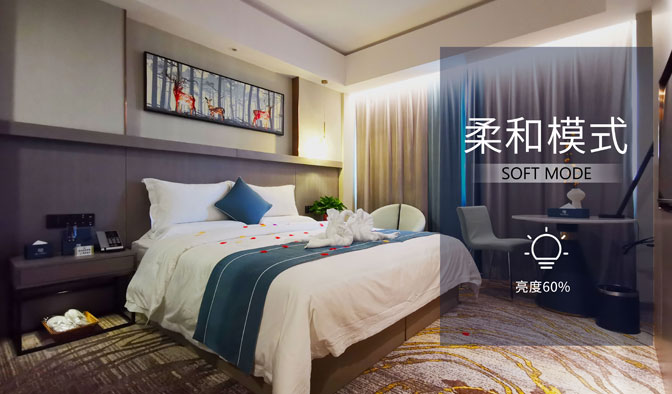 插卡取電即可觸發(fā)。明亮模式下,設(shè)置好的燈光同時(shí)亮起,亮度根據(jù)照明調(diào)整100%明度。使客人一進(jìn)入房間就能看清空間布局,增加步入陌生區(qū)域的心理安全感。 ● 柔和模式 ●