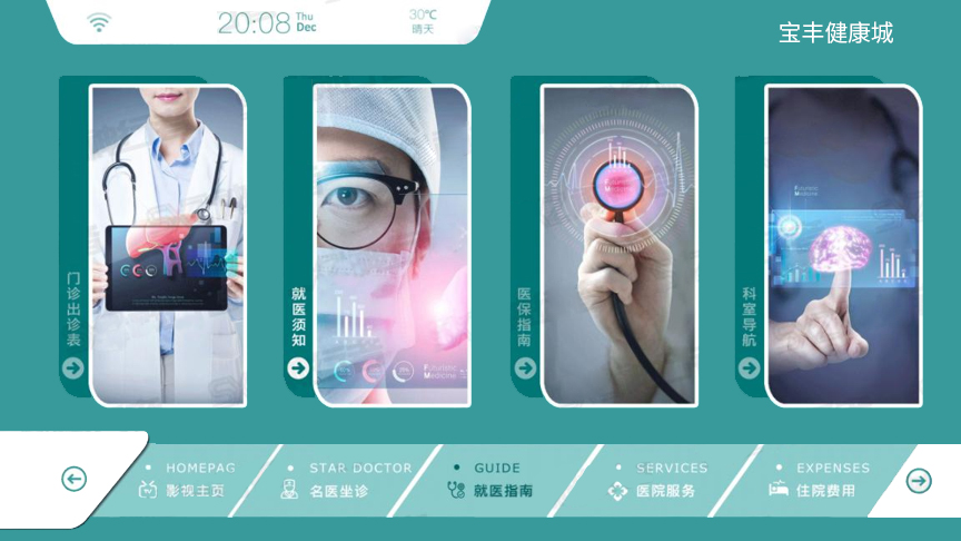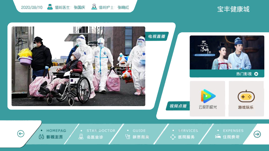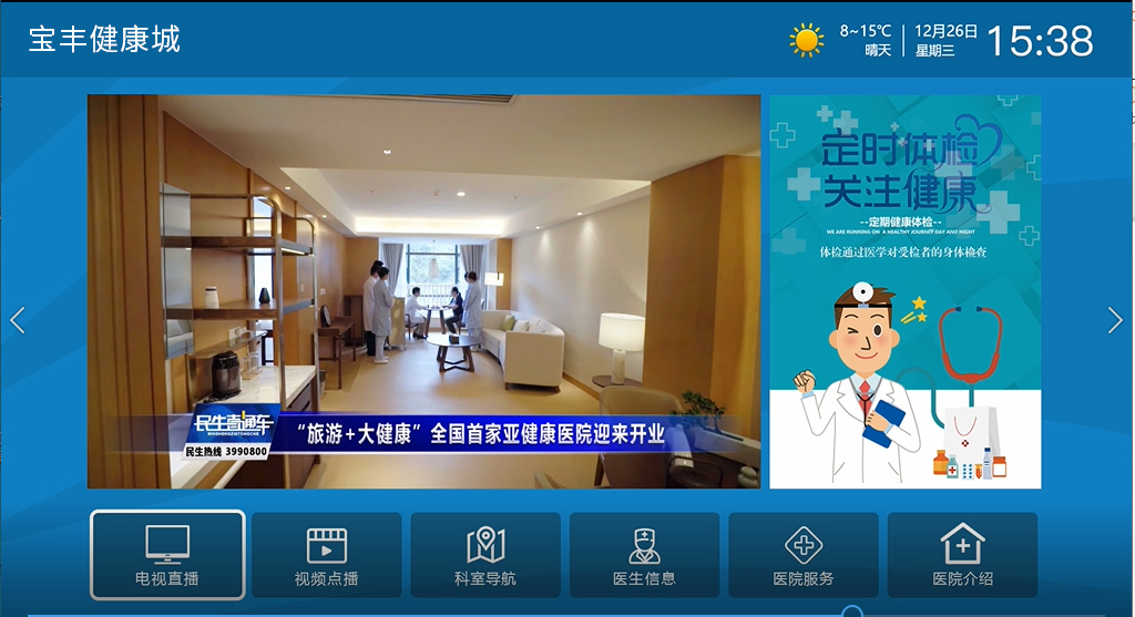 佳視通多媒體互動(dòng)電視——醫(yī)院篇 佳視通多媒體互動(dòng)電視—醫(yī)院篇,開機(jī)視頻播放完自動(dòng)跳轉(zhuǎn)到首頁,電視直播實(shí)時(shí)新聞動(dòng)態(tài),首頁可實(shí)現(xiàn)醫(yī)院介紹、醫(yī)院名稱、日期、時(shí)間等內(nèi)容,支持中英文切換模式,醫(yī)院頁面背景圖片支持自定義、根據(jù)醫(yī)院的風(fēng)格部署不同的背景圖片。 1、定制開機(jī)視頻,界面上面板塊顯示醫(yī)院LOGO、時(shí)間、日期、位置、天氣等; 2、強(qiáng)制插播緊急通知/視頻,左邊視頻展示板塊,可以自定義播放實(shí)時(shí)新聞動(dòng)態(tài)。可以播放醫(yī)院的宣傳視頻等資源; 3、右邊圖片展示區(qū)域,滾動(dòng)播放、功能板塊6個(gè),可以自主編輯名稱;