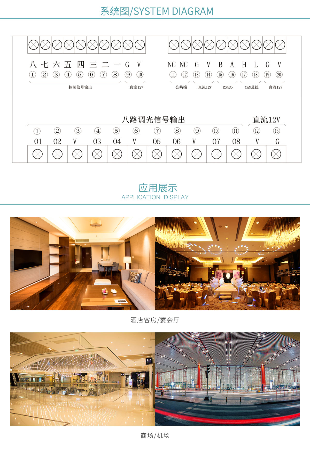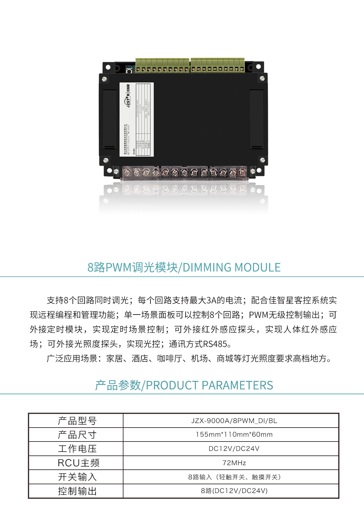 支持8個(gè)回路同時(shí)調(diào)光;每個(gè)回路支持最大3A的電流;配合佳智星客控系統(tǒng)實(shí)現(xiàn)遠(yuǎn)程編程和管理功能;單一場(chǎng)景面板可以控制8個(gè)回路;PWM無(wú)級(jí)控制輸出;可外接定時(shí)模塊,實(shí)現(xiàn)定時(shí)場(chǎng)景控制;可外接紅外感應(yīng)探頭等。